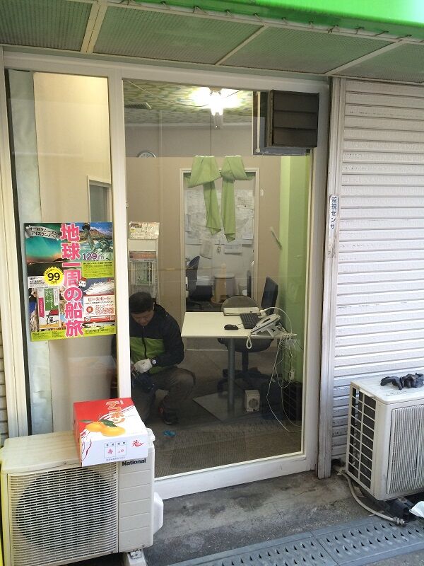 弊社の所在地と同じ兵庫県尼崎市杭瀬本町にある不動産会社様から「店舗の側面のガラスに物をぶつけてヒビを入れてしまった。ガラスの交換に来てくれないか」とのご依頼でした。お店のヒビ割れたガラスを見に行くと、入り口の横にある住宅情報を貼っているガラスに、斜めの大きなヒビが入っていました。
